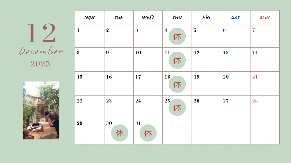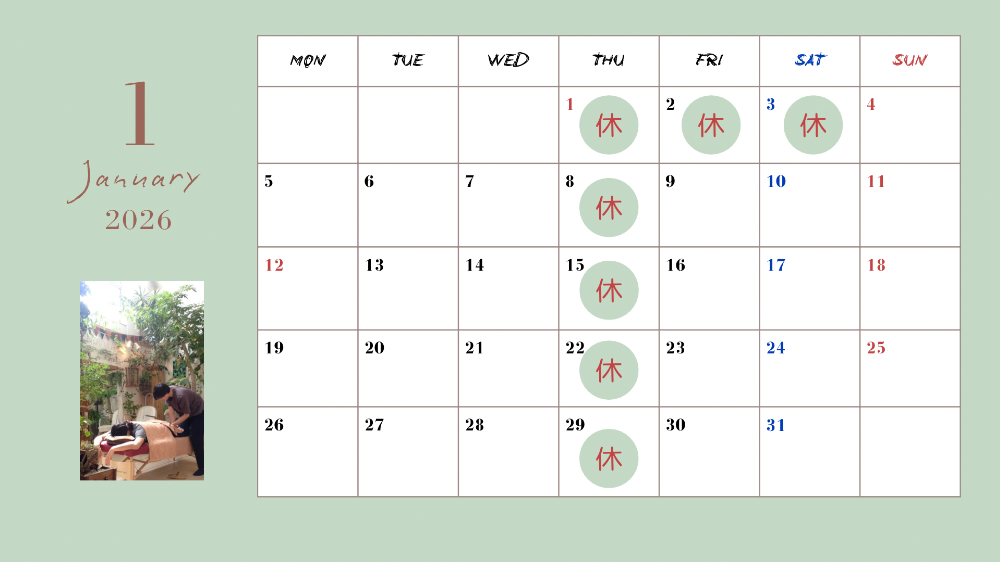 12月と2026年1月のカレンダーになります。年内は29日(月)までとなります。30日(火)〜1月3日(土)の5日間、年末年始のお休みを頂きますので宜しくお願い致します。ご予約にはまだまだ空きがありますのでいつでも気軽にご連絡・ご相談ください。皆さんお忙しい12月かと思いますがお身体も良い状態で新年を迎えるお手伝いをさせて頂けたらと思います。今月も宜しくお願い致します。